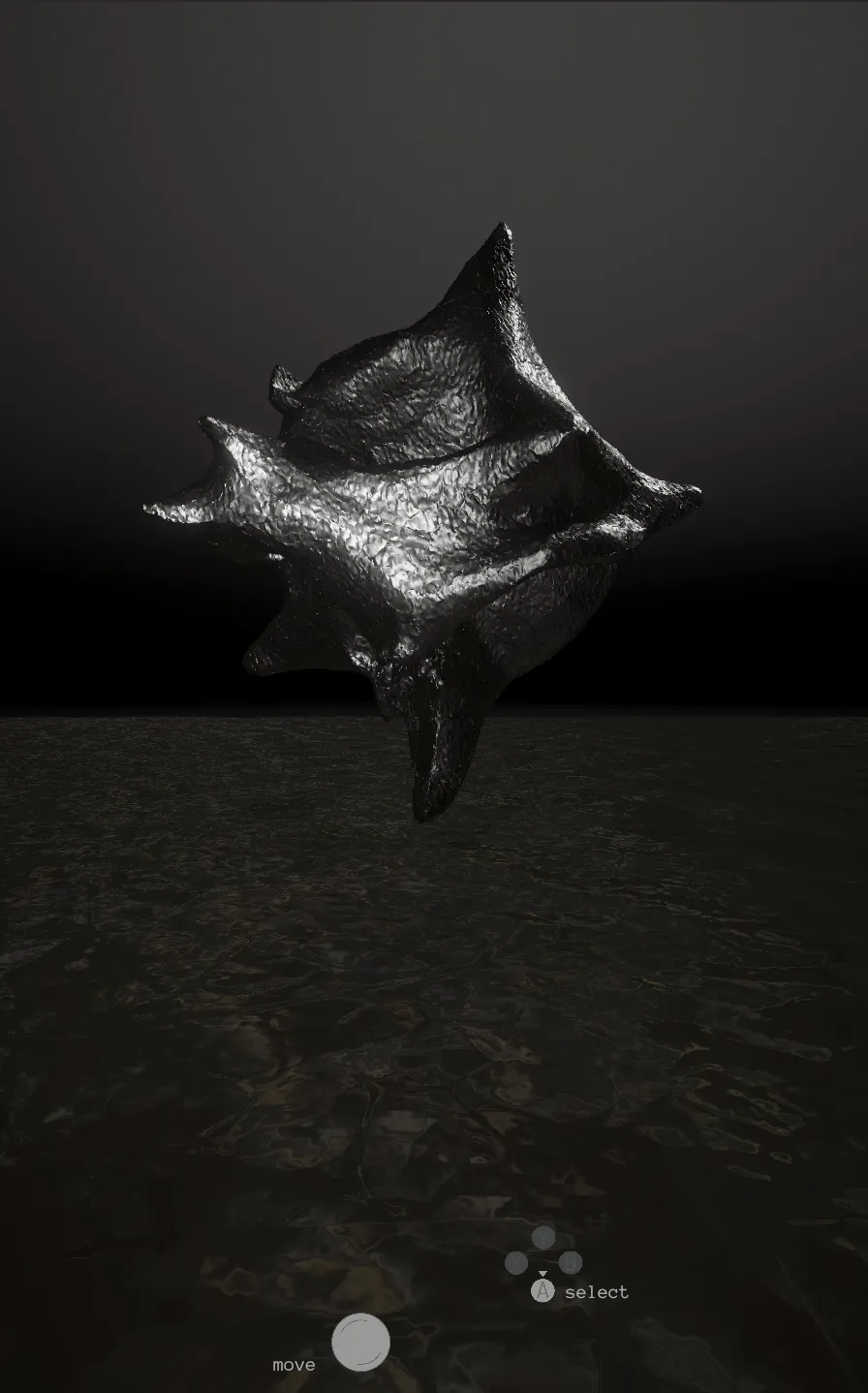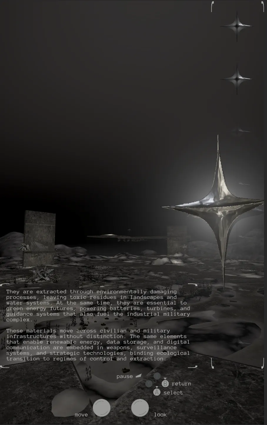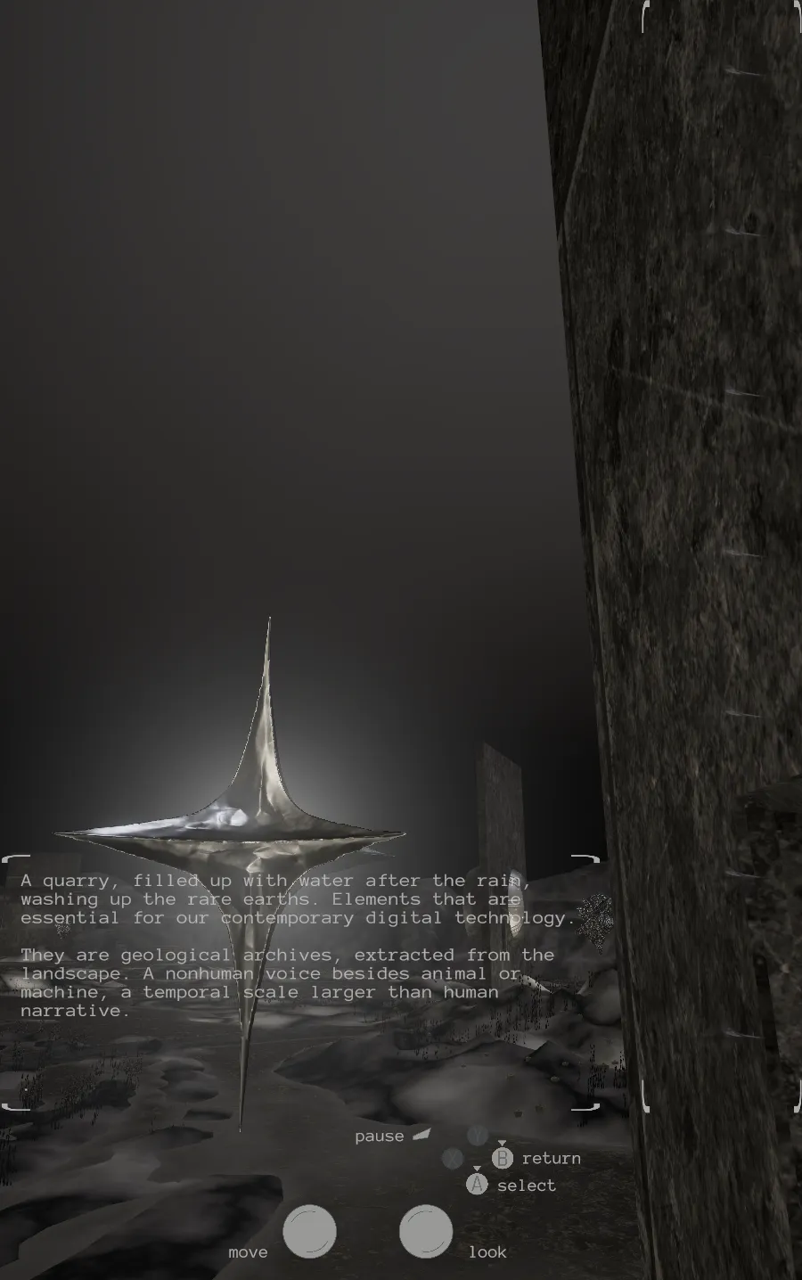 NEW ORACLES is a vertically framed exploratory game embedded in a wall mounted sculpture. Set in a flooded quarry, the player moves through abandoned infrastructure. Shiny portals and star-like objects reveal poetic and factual texts on rare earth elements, grounding digital technology back into geology.