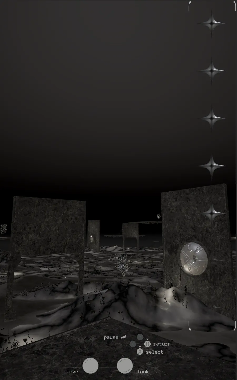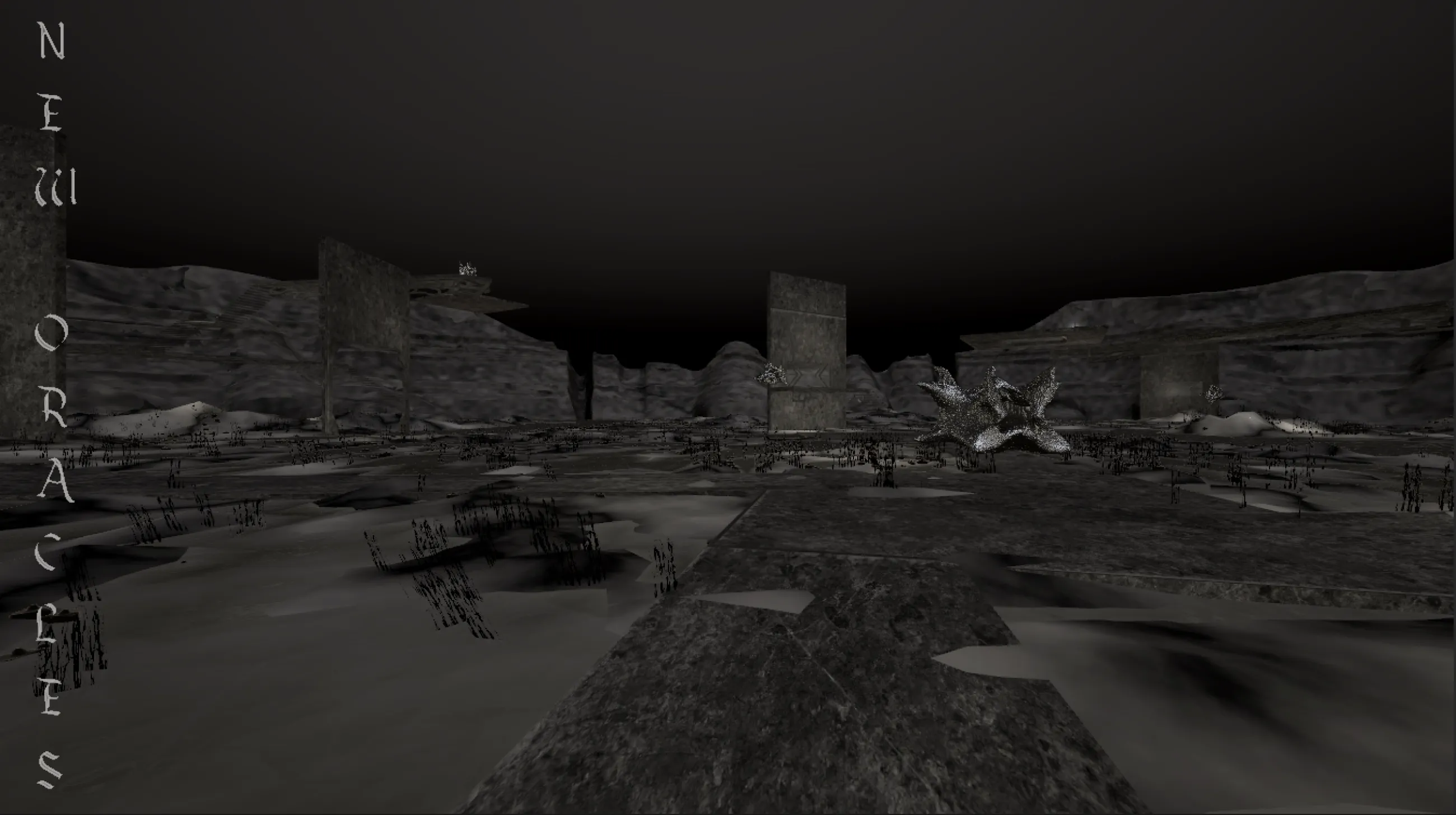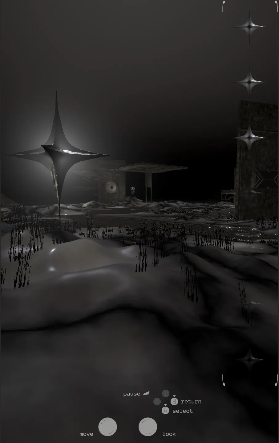 NEW ORACLES is a vertically framed exploratory game embedded in a wall mounted sculpture. Set in a flooded quarry, the player moves through abandoned infrastructure. Shiny portals and star-like objects reveal poetic and factual texts on rare earth elements, grounding digital technology back into geology.